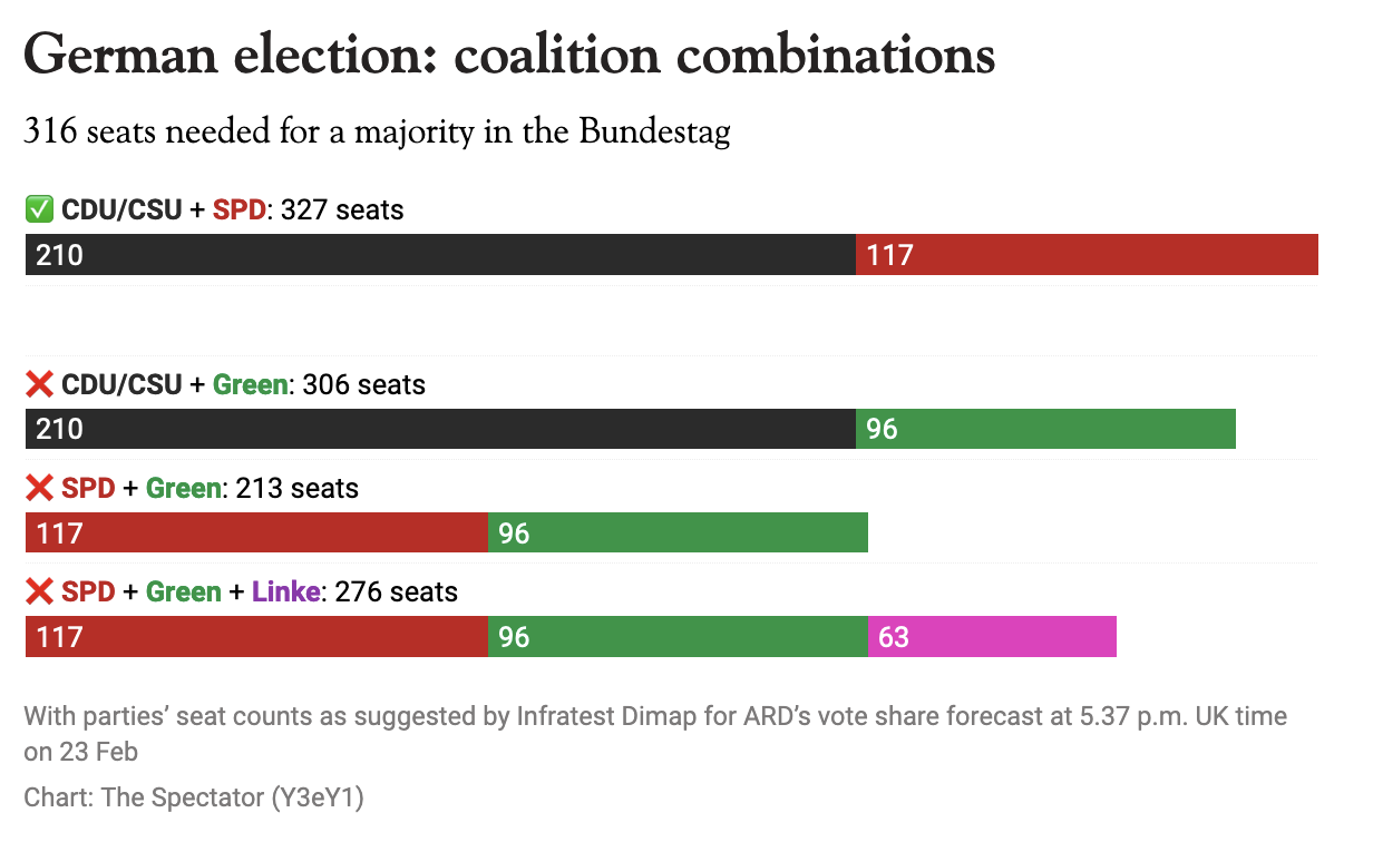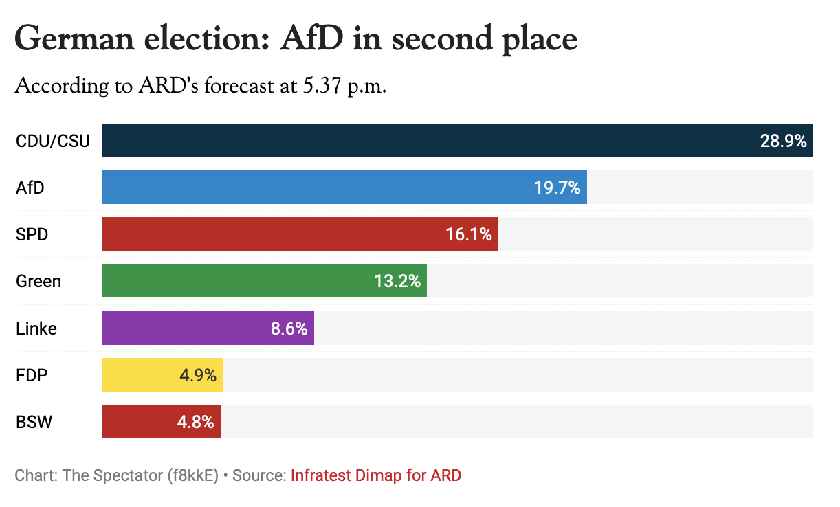 Now, for Merz, the hard work begins on attempting to form a coalition government. With the CDU leader insisting he wouldn’t jeopardise the ‘Brandmauer’ around the AfD – the firewall agreement between the establishment parties not to collaborate with the far-right party in government – the exit poll suggests Merz has just one viable option: to partner with the SPD. This would give the so-called grand coalition – or ‘GroKo’ – a projected 327 seats, just 11 above the 316 needed for a majority. Nevertheless, should the BSW or FDP indeed sneak into the Bundestag as official results are locked in over the coming hours, this may force Merz to take on a second coalition partner to create a less stable three-way formation.