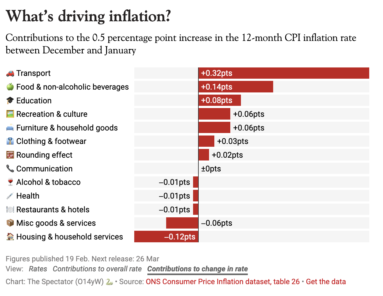 Prices are rising. Inflation rose to 3 per cent in the twelve months leading up to January, up from 2.5 per cent in December. It’s a bigger jump than expected, with markets and the Bank of England expecting a rise to 2.8 per cent, driven largely by higher transport costs, as well as higher costs for food and non-alcoholic drinks.