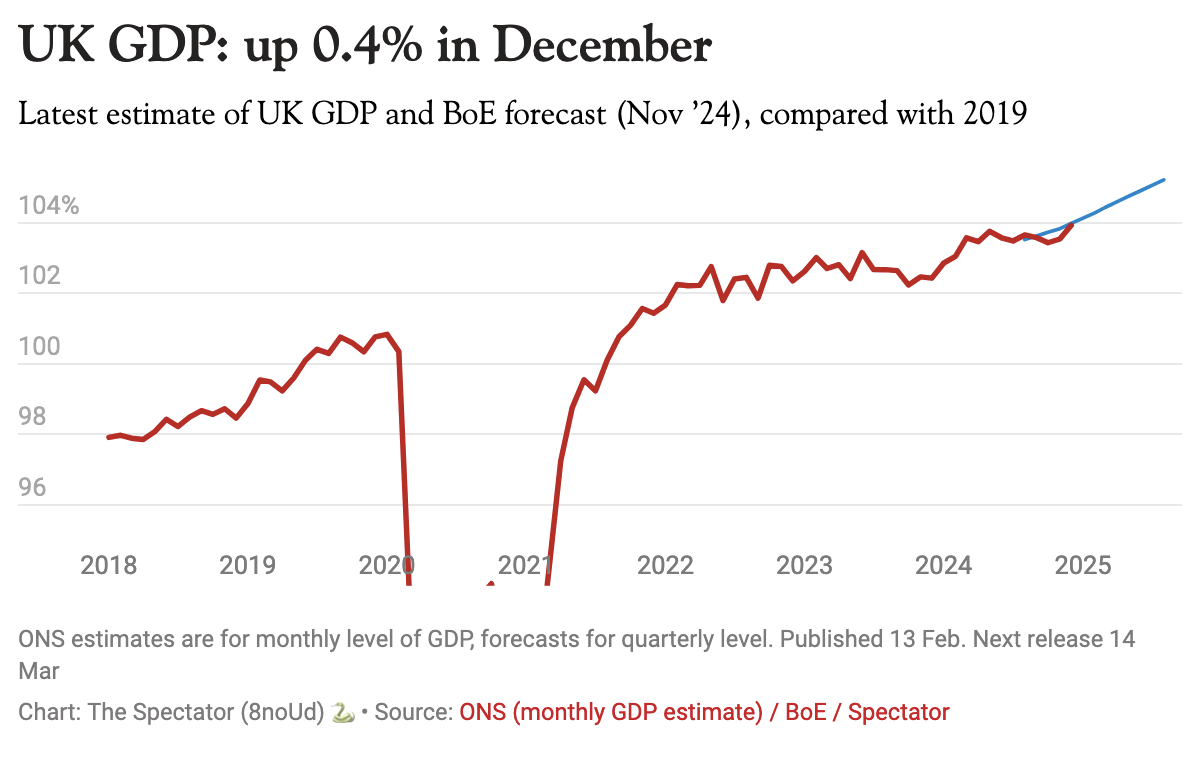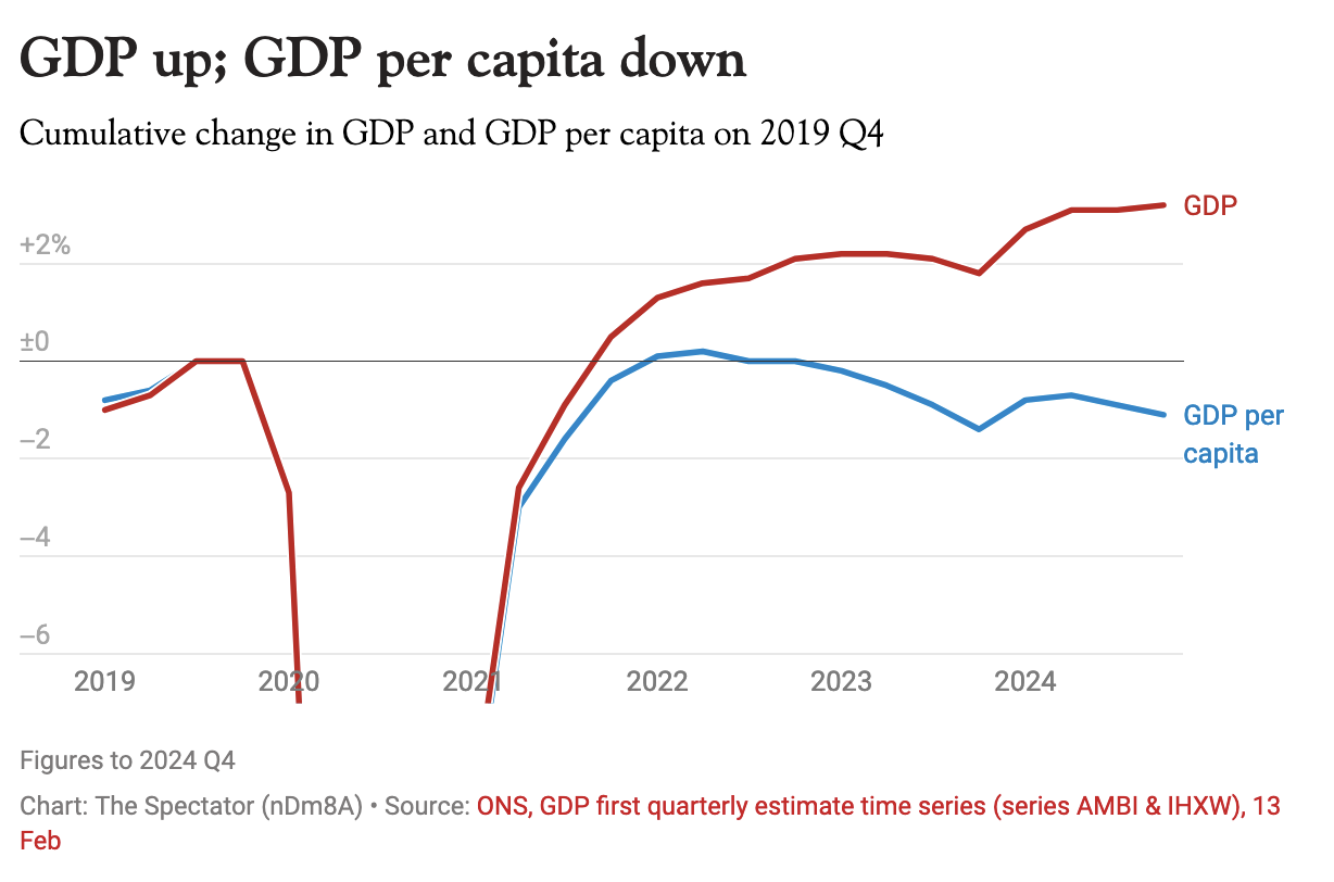 GDP per head is indeed down 0.1 per cent for 2024, reflecting the country’s living standards. The government will no doubt want to focus instead on the positive growth figures this morning. December’s figures were a welcome surprise. But the problem remains the same for Labour as it did for the Tories: you can’t convince people to feel better off than they do. Moreover, it’s very difficult to make the case that 0.1 per cent growth is really evidence that the UK is on secure economic footing. Small changes – or a revision – could produce a negative growth figure instead.