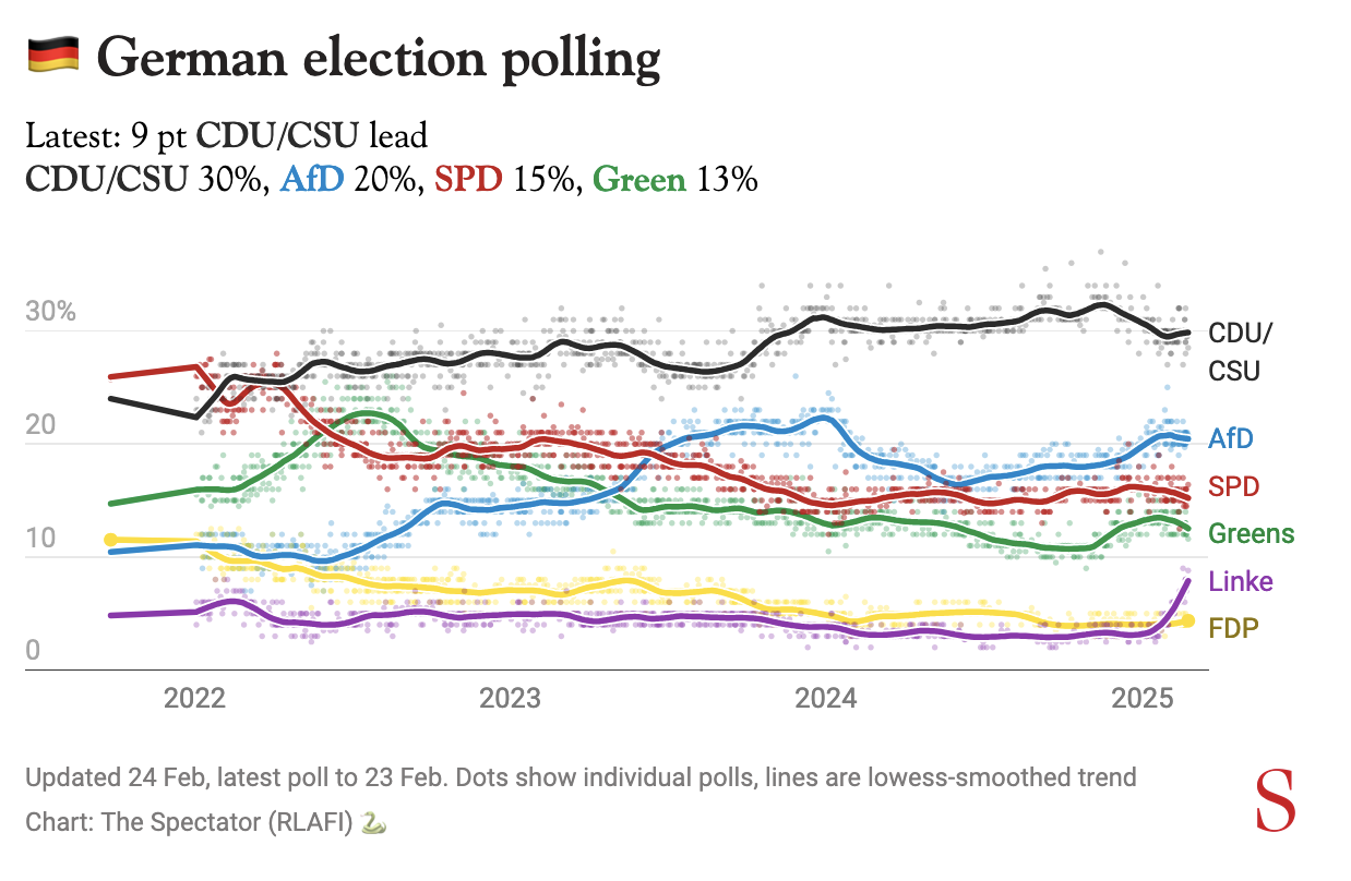 After two long months of campaigning, Germany heads to the polls today for its federal election. Approximately 60 million voters across the country’s 16 states will elect the new government. Will incumbent SPD chancellor Olaf Scholz’s party be punished for his three years in power? Will the far-right Alternative für Deutschland (AfD) cruise to its highest ever federal result? Will Friedrich Merz’s conservative CDU do well enough to only need one partner to form a coalition? This is what to watch out for tonight.