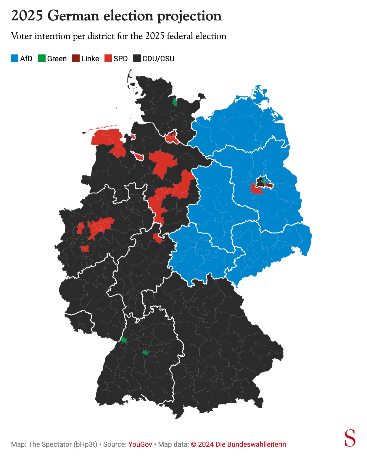For Olaf Scholz, the map of how the country intends to vote makes for humbling viewing. Compared to the last federal election in 2021, when the SPD turned all but four of the states red, the party’s hold on the country has been reduced to the small northern city-states of Bremen and Hamburg. Even then, there is a chance the CDU could steal away Bremen from the party as well.