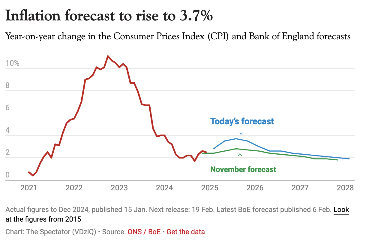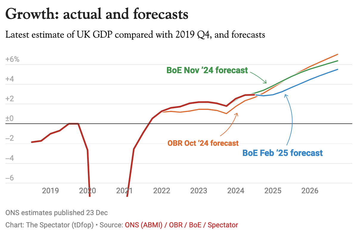 Even so, the MPC pushed ahead – interestingly with no one on the committee voting to hold rates at 4.75 per cent (two members voted instead for a 0.5 percentage point cut). It’s clear from the Bank’s report that the MPC is increasingly focused on how higher rates have taken their toll on economic growth, noting that ‘GDP growth has been weaker than expected at the time of the November Monetary Policy Report, and indicators of business and consumer confidence have declined’. Today the Bank revised its growth forecasts down substantially for 2025 Q1, from 1.4 per cent on the year to just 0.4 per cent. It’s not until 2027 that growth forecasts are revised up, just marginally, with no year in this Parliament forecast to pass 1.8 per cent in growth.
