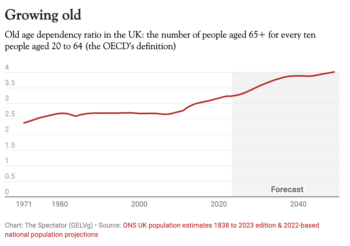 This Ponzi scheme worked while we had a growing working-age population. But that hasn’t been the case for a while. The worker-to-retiree ratio is going in the wrong direction: more oldies, fewer workers. Today there are around three pensioners to every ten workers. By the 2040s there’ll be more like four. Already we’re spending £137.5 billion this year on pensions, up from £125 billion last year, which makes Liz Kendall’s £5 billion of savings on personal independence payments look piddling.