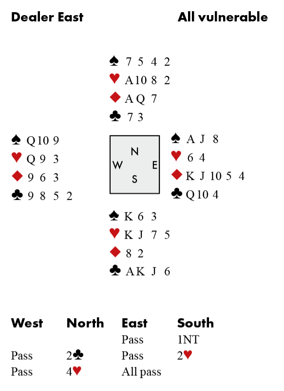 West elected to start with the ♣️8 to the Queen and Ace, and South decided to take an immediate Diamond finesse. This was a good play for several reasons: you find out where you are on the hand, and it opens up some later possibilities of putting West on lead to play Spades. East won and played back the ♦️J.