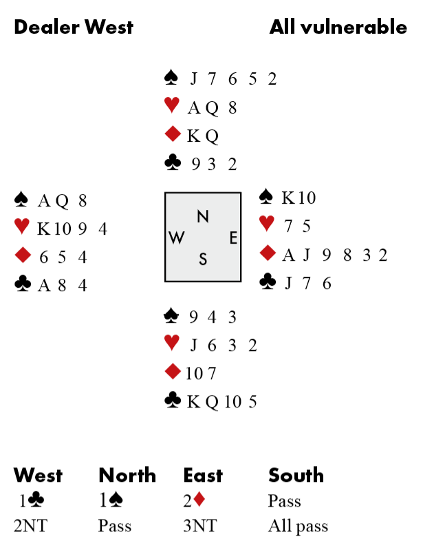 West had a weak NT and had shown up with six points (♠️AQ). If he held the ♥️K, along with the ♣️A or ♣️K, I should play a club – partner could knock out West’s honour, removing the entry to his hand before he could unblock his spades. If West held the ♥️K(xx) and ♣️KQ, Sebastian could win the ♣️A and push a heart through.