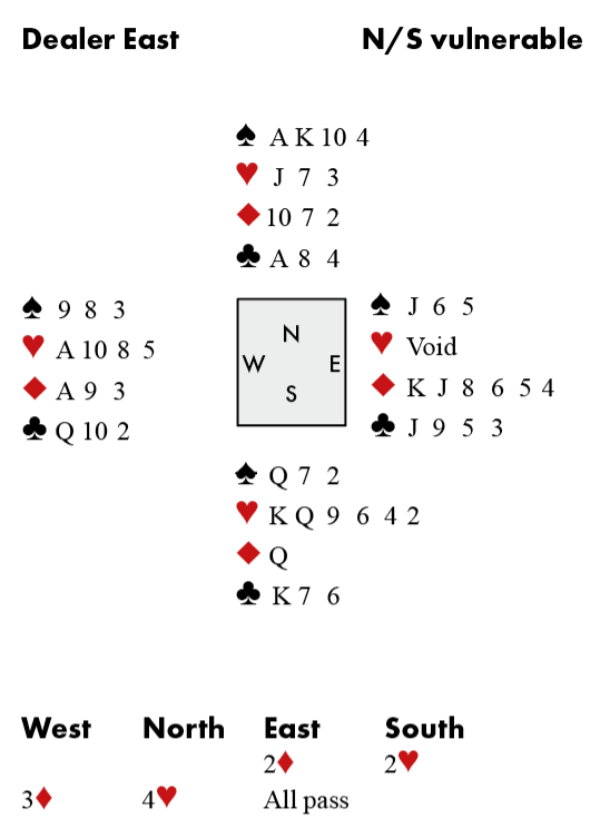 ‘I don’t know,’ said North to her partner, showing that she was no great countess herself. ‘With East being void in Hearts, he’s more likely to have three Spades, isn’t he?’