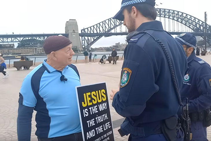 On Thursday, a Sydney street preacher attempted to merely walk around the forecourt of our most iconic building, the Sydney Opera House, holding a small placard that read, ‘Jesus is the way, the truth and the life.’ In smaller print beneath, ‘No one comes to the Father except through me.’