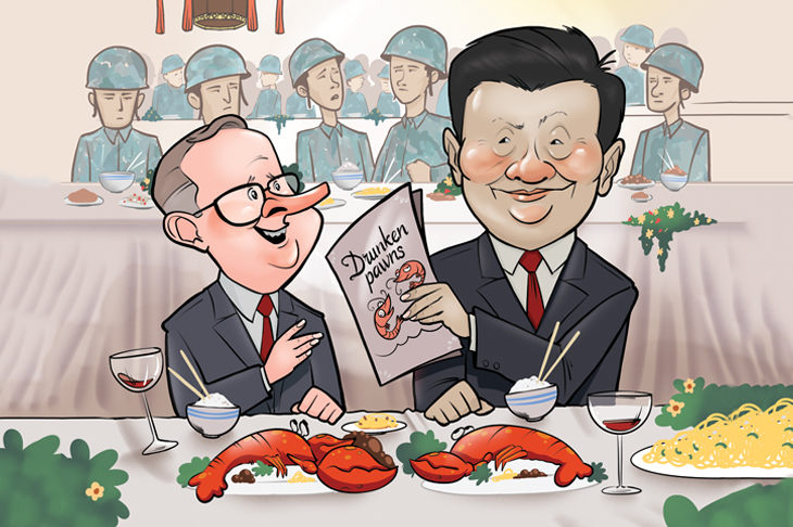 Mr Albanese’s trip is being sold as a major trade mission, with a bevy of ‘business leaders’ tagging along for the drunken prawns. But thus far, most of the trade talk appears to be based on wishful thinking and the comical fantasy of ‘green hydrogen’, ‘green steel’ and Australia becoming a ‘renewables superpower’. Quite how Mr Jinping manages not to spit out his rice wine in mirth every time he hears these ludicrous expressions is a mystery.