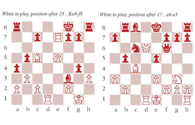 The first big moment. If White can collect the b4 pawn and consolidate with Ne2-c3, the game will be strategically won. Rapport’s solution is an ingenious long-term piece sacrifice. Nxd5!! 16 exd5 16 Qxd5 Be6 is awful for White, e.g. 17 Qxd6 Bxa2+ 18 Kc2 Qc8+ 19 Kd2 Rd8 wins the queen. Bf5+ 17 Ka1 Ra4 Coolly defending the b4-pawn. The preceding sacrifice on d5 serves to dissuades White from the b2-b3 jab, due to the latent influence of the Bg7. For example, 18 b3 Ra5 19 Qxb4 Rxb5 20 Qxb5 Qc7! (20…e4+ 21 Nd4 is premature) 21 Qc4 Qe7 and the combined ideas of Rf8-c8 and e5-e4+ mean that Black stands well, despite being down a whole rook. 18 Nc1 Qd7 19 Bc4 Rc8 20 Qe2 e4! 21 Bb3 Defusing the attack with 21 fxe4 Bg4 22 Qd3 Bxd1 23 Rxd1 looks sensible, but there is a flaw. After 21 fxe4 b3!! the Ra4 creates havoc across the rank. One beautiful finish that could arise is 22 Bxb3 Rxe4 23 Qf1 Rb4 24 Na3 Qa7 25 Nb1 (to duck …Qa7xa3) Rc2! 26 Nc3 Qa3! with mate soon to follow on the long diagonal. exf3 22 gxf3 Ra5 23 Bc4 23 Nd4 was the lesser evil, though 23…Rxc1+ 24 Rxc1 Bxd4 25 Qd2 Bc5. Black retains excellent chances with a minimal material deficit.