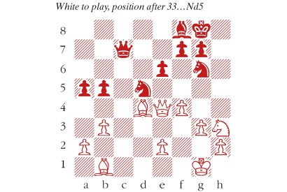 Nakamura–Carlsen, August 2020. Carlsen has just advanced 40…g6-g5+, laying a nasty trap. Only one move gives White a fighting chance…