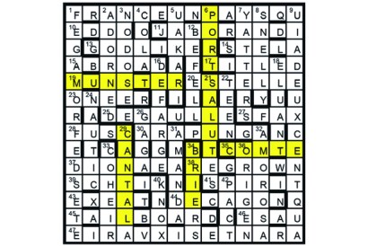 Seven identical two-by-two squares in the completed grid must be highlighted to depict the unclued entries, each of two words.…