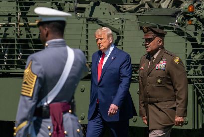 The iconic flags flutter from masts behind the podium. A woman stands before the microphone dressed in black, her mask…