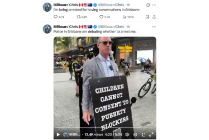 Billboard Chris, defender of children’s rights against trans activism, is in Australia this week to ‘do battle’ with Australia’s eSafety…