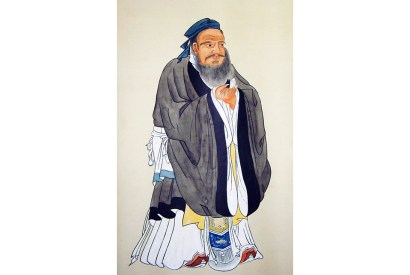 On a quiet street in Belgrade, a bronze statue of Confucius stands in front of a perforated white block, the…