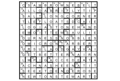 The unclued lights, as well as KEITH, are Scottish place names. TARBERT was required at 28A, rather than LARBERT. First prize Una…