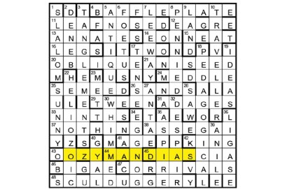 The poem was Shelley’s ‘Ozymandias’. The words from the poem are LEGS (16), TWO (17A), SANDS (26), NOTHING (37), KING…