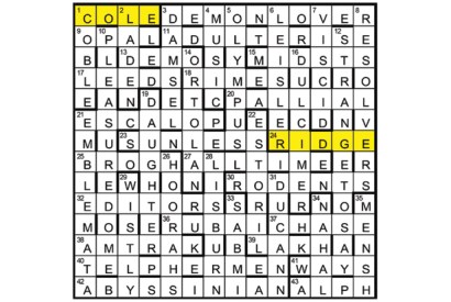 Unclued lights (one hyphened) are words from a poem whose subject appears in the completed grid. A clued light is…