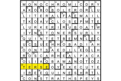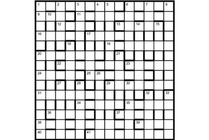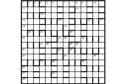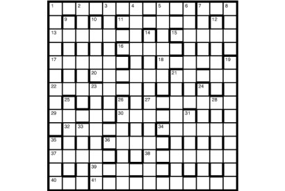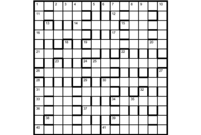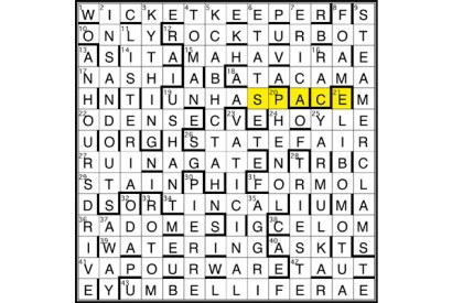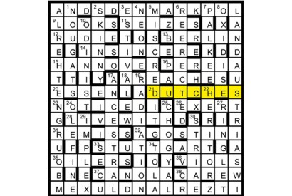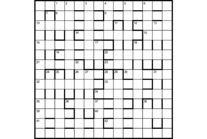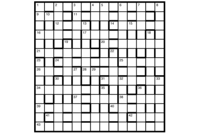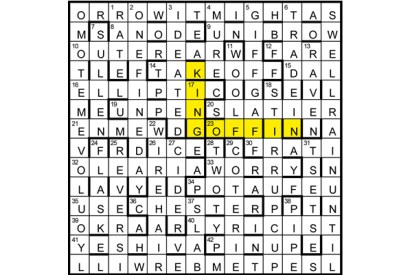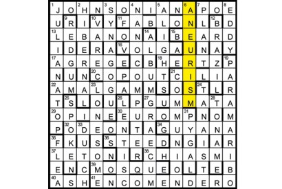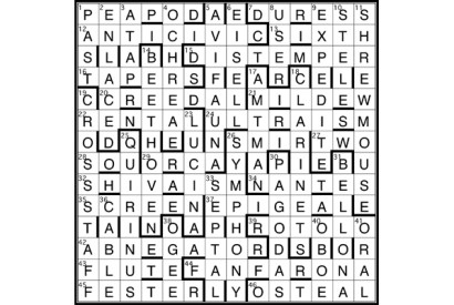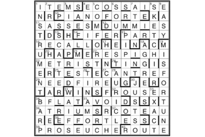 Seven identical two-by-two squares in the completed grid must be highlighted to depict the unclued entries, each of two words.…