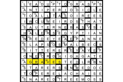 The theme word is GRAVES: 19, 34 and 40 are famous cemeteries; 17, 28 and 39 are wines from SW…