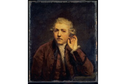 In front of the banner advertising the RA Summer Exhibition, the swagger statue of Sir Joshua Reynolds (1723-92) by Alfred…
